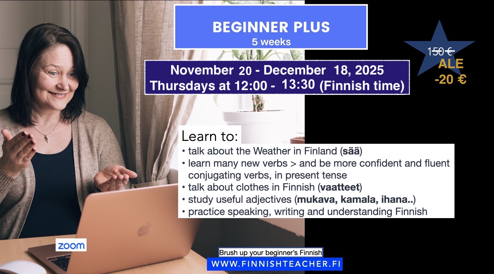 This is a highly interactive course aimed at improving your spoken Finnish through constant practice. You can join as many times as you need—keep coming until you feel confident speaking Finnish!